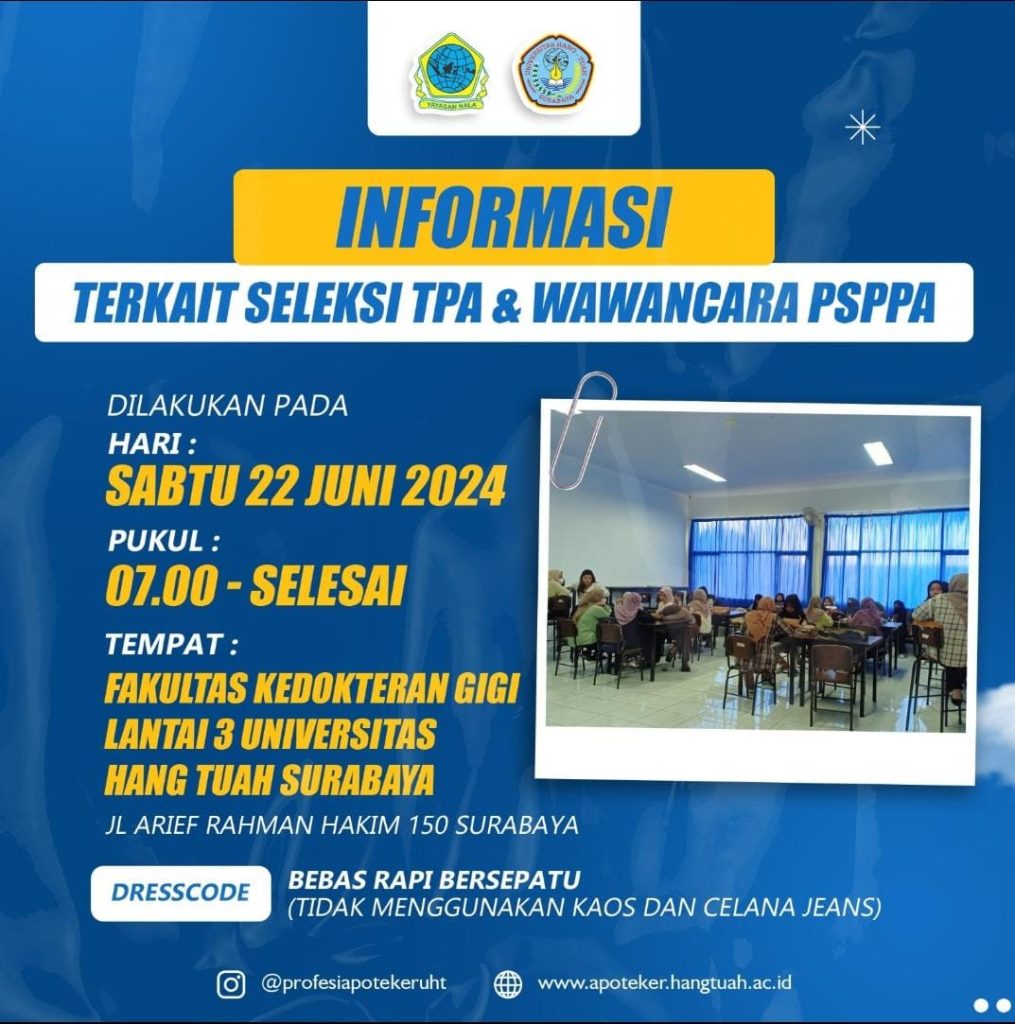 Seleksi Kompetensi (CBT Test & Wawancara) mahasiswa baru Prodi Pendidikan Profesi Apoteker dilaksanakan pada :